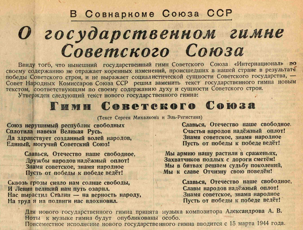 nekrasovka.ru 14 декабря 1943 года постановлением Политбюро ЦК ВКП(б) был принят гимн СССР. Уже в ближайшую новогоднюю ночь советские граждане впервые услышали "Союз нерушимый республик свободных..."